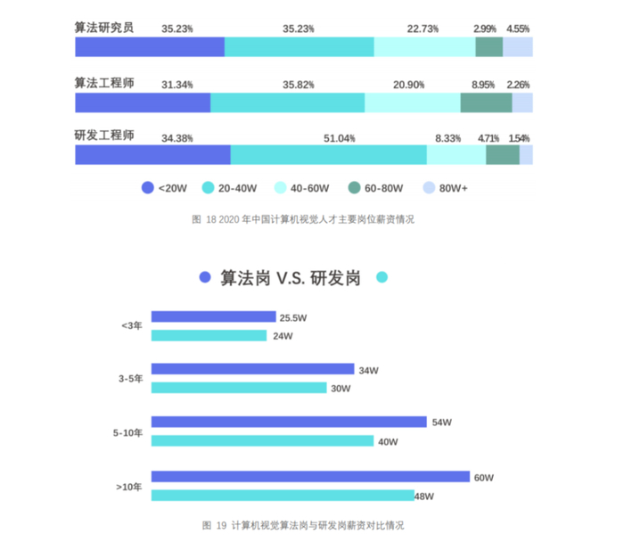 计算机视觉算法研究员在2020年度平均薪资(年薪)为 328,977 元,算法工程师为 348,507 元,研发工程师(指计算机视觉领域企业/项目中,非算法类研发岗位,如系统架构师、软件工程师)为 294,271 元,AI 产品经理(指计算机视觉领域企业/项目中的产品经理)为 274,265 元;四类岗位的平均年薪差距在 7.5 万元以内。由此可见,在 2020 年疫情影响下,计算机视觉领域人才的薪资收入仍处于较高水平,且本领域各岗位的优秀人才均能获得丰厚的报酬。