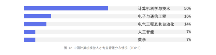 在学术背景方面,50%左右的计算机视觉人才来自于计算机科学与技术专业。由于计算机视觉技术的发展涉及多种交叉学科,本次调研中也有超过40%的计算机视觉人才来自电子与通信工程、电气工程与自动化、数学等非计算机专业。