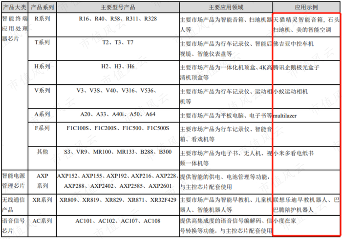公司主要研发和设计的芯片产品可细分为10大系列,分别应用在平板电脑、互联网机顶盒(OTT)、车载车机、智能音箱、早教机等不同终端电子产品上。