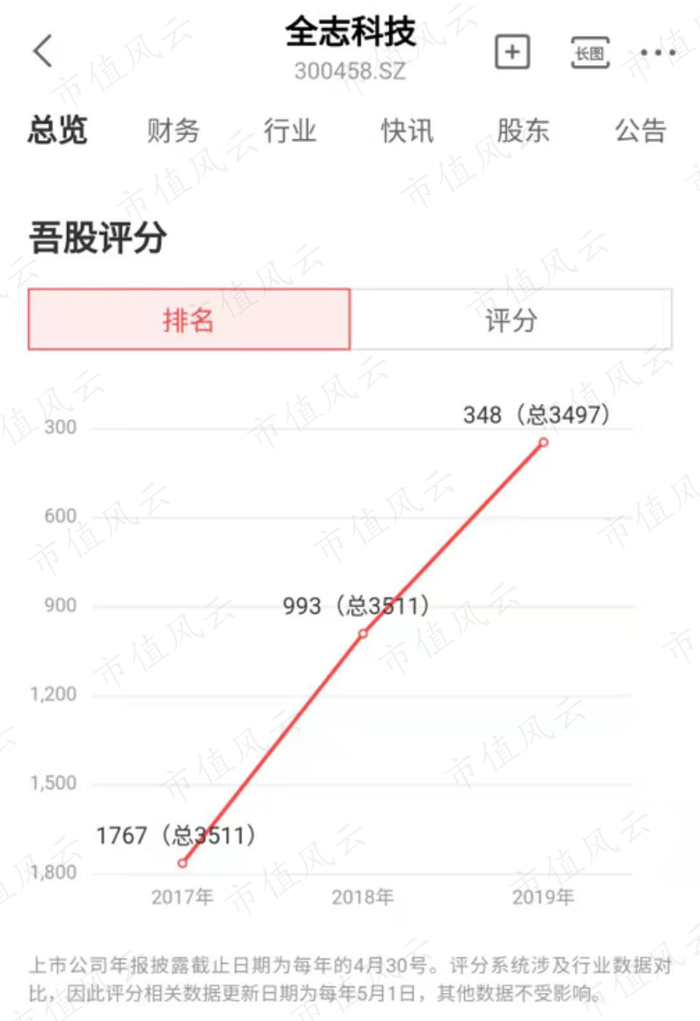 2017年~2019年,全志科技(300458.SZ)在市值风云“吾股”大数据评级系统中的排名从1767名上升至348名。