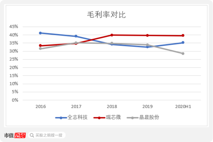 盈利能力上,2016年起全志科技的综合毛利率开始走起了“下坡路”。公司的产品平均售价从2017年的10.61元/颗下降至2019年的6.72元/颗。