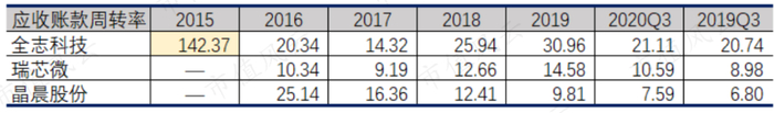 2015年以后,全志科技的应收账款周转天数基本稳定在10天~30天左右。相较之下,2018年起瑞芯微、晶晨股份的应收账款回收效率都低于全志科技。