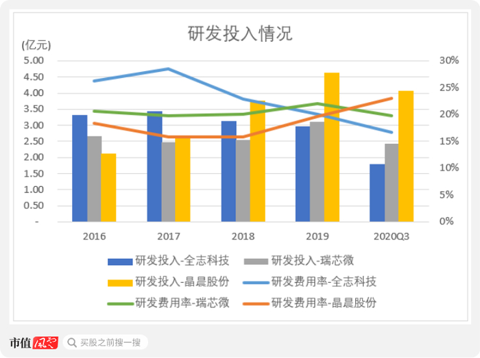 与竞争对手晶晨股份、瑞芯微相比,2019年以前全志科技研发费用率最高。接下来的2019年、2020年前三季度,晶晨股份和瑞芯微在研发投入金额、研发费用率比上都更大。