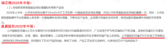 瑞芯微在2020年中报中宣布已成功研发出基于14nm FinFET工艺的新一代智能视觉应用处理器;而晶晨股份的多个新一代Soc芯片(如智能电视、AI音视频系统终端、V系列汽车电子芯片等产品)都已采用12nm制程工艺。