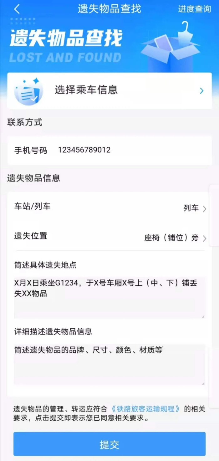 注:为了更准确识别和寻回遗失物品,要尽量详细提供乘坐列车的车次、车厢号、座位号,遗失物品的位置、品牌、尺寸、颜色、材质等基本信息,一定留好联系方式哦!