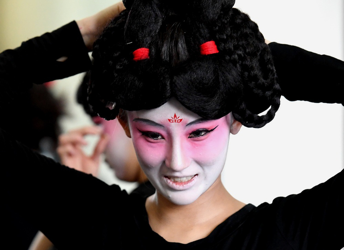 郑州歌舞剧院的演员整理假发(2月20日摄)。等台前,演员们化装需要近3小时。