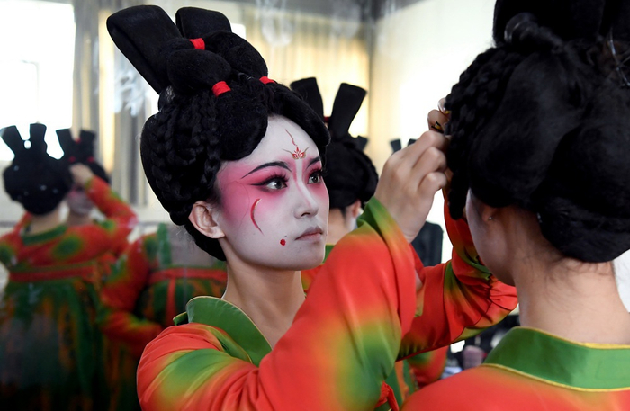 郑州歌舞剧院的演员在化装(2月20日摄)。