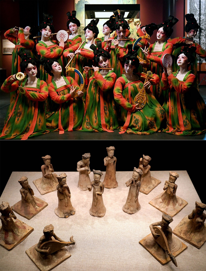 在《唐宫夜宴》中,14位灵动可爱唐朝美人的真实身份,其实是皇宫里的女乐官,整个舞蹈讲述的就是她们在去皇宫夜宴表演过程中发生的一系列趣事。舞蹈没有大气恢宏的气氛,而是从女乐官推攘玩闹,梳妆打扮的生活小事出发,一举一动像极了现代的女孩们,又会觉得她们像从历史中走来一样,鲜活而灵动。 上图:郑州歌舞剧院的演员在录制河南博物院元宵奇妙夜节目(2月20日摄)。下图:河南博物院主展馆内展出的展品(2020年9月24日摄)。