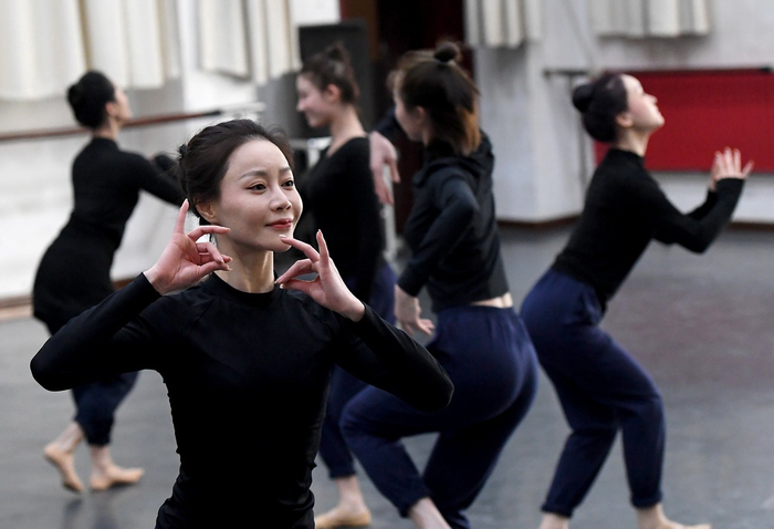 郑州歌舞剧院首席演员易星艳(前)在排练厅内排练(2月20日摄)。