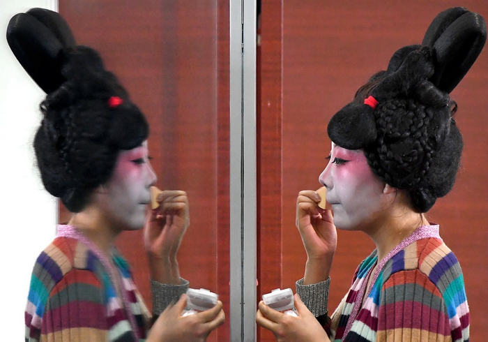 演员带妆排练(2月20日摄)。演员们用厚厚的海绵衣塑造丰腴的身形,在嘴里塞医用脱脂棉球来让脸完美地“胖”起来。