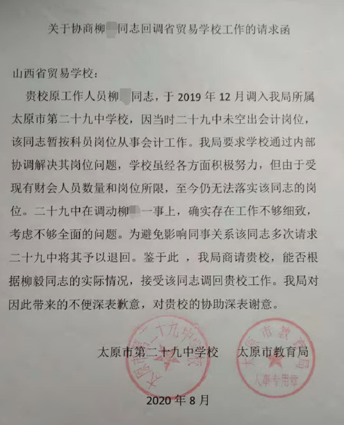 无奈之下,柳某只能向太原市教育局反映情况。在一份由太原市教育局和太原市第二十九中学校共同出具的《关于协调柳某回调省贸易学校工作的请求函》上,红星新闻记者看到,该请求函称,太原市第二十九中学校确实存在工作失误,目前受现有财会人员数量和岗位限制,至今无法落实柳某的岗位,因此太原市教育局特商请山西省贸易学校接受柳某的调回申请。“我们确实向省贸易学校发过协商的函,但对方拒绝了。”太原市教育局人事科一工作人员告诉记者,在得知柳某的情况后,该局相关领导便多次为其协商解决,但因各单位用人制度和内部系统并无相应空缺岗位予以调剂,一直未能有效解决,“我们也希望柳某能先回到二十九中暂时工作着,但他不愿意。”2月20日,红星新闻记者联系上李某,其表示自己已在年前退休,不再处理此事,但此前柳某调入学校确实是她负责,“当时他来学校后,一直要求从科员转会计,后来还因为这件事‘要挟’不工作。”李某说,因学校财会工作需要有人维系,加上原会计吴某身体康复,愿意返校继续工作,学校便决定仍让吴某做会计。对此,吴某也向红星新闻记者称,此前因忙其他项目,外加身体原因,她无法返回学校工作,后来身体恢复后,学校曾问她能否继续工作,“我说行,就回学校了。但在此之前,学校从未和我商量过任何有关岗位调动的事,我也不知道柳某的事。”“我并非不愿意回学校工作,而是学校会计岗上此时已有人,学校也不缺科员,就此作科员与学校当初调动我的本意不符。”柳某表示,他在去年五月离校后,已社会性“失业”大半年,但每月不做事仍能收到财政局发放的近3000元工资,“感觉自己就像是被迫在‘吃空饷’一样。”