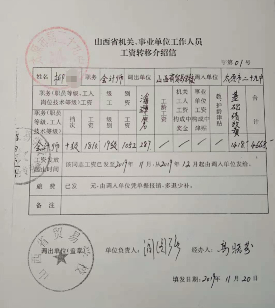 但当柳某以科员身份调入太原市第二十九中学后,却发现实际情况与他的预期并不相符。“首先,李某并未按约定将我转为会计岗,还在没与我沟通和未签订岗位聘用合同的情况下,办完我的调动手续,将我聘任为科员,聘期三年,并上报给了人社局。”柳某说,也因此,他的工资和与工资相关的各类社保等发放标准均发生了变化,“差额有500元到1000元。”