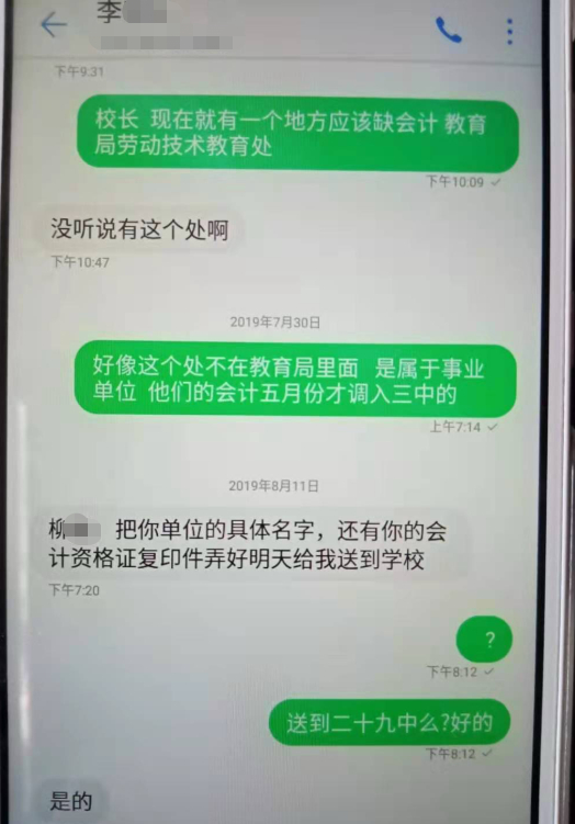 2019年8月11日,李某以短信方式通知柳某第二天带着相关证件到太原市第二十九中学面谈。“去了后,她告诉我,二十九中现在缺会计,问我愿不愿意调过去。”柳某告诉红星新闻记者,当时李某称其学校的老会计生病了,有意愿腾出岗位,“还说学校目前的会计工作是聘请的临时工在做,不符合相关规定,问我是否愿意调过去。”