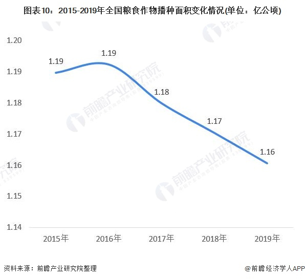 农药广泛用于农林牧业生产,从全国粮食作物播种面积来看,2015-2019年全国粮食作物播种面积不断下降,2019年下降为1.16亿公顷。