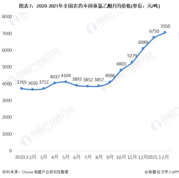 农药中间体价格方面,以农药中间体氯乙酸为例,氯乙酸是作制取乐果,萘乙酸,硫氰醋酸,异茨酯,除草剂2,4D,除莠剂等的中间体。据Choice数据显示,自2020年8月,农药中间体氯乙酸价格不