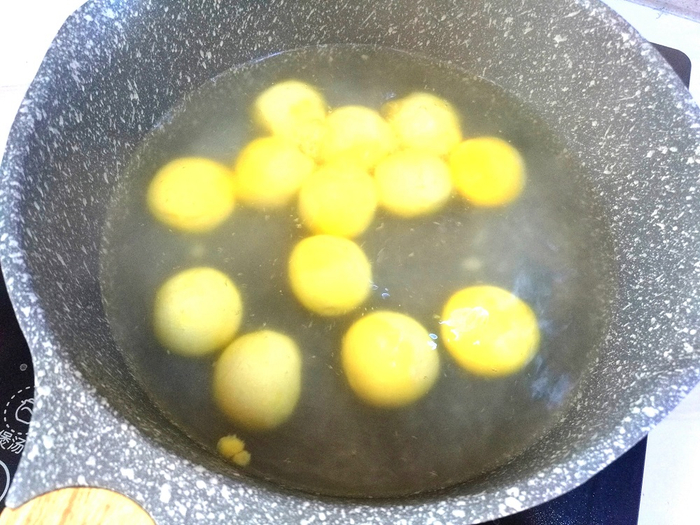 7.锅中放油,油温三成热,也就是放入筷子冒下泡时,放入汤圆。