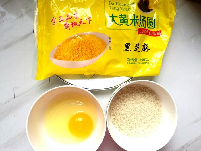 汤圆、鸡蛋液、面包糠