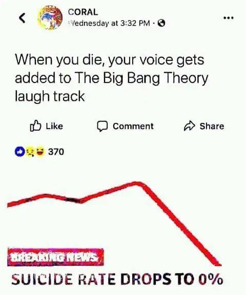 Reddit网友们经过严肃讨论一致认为,想让自杀率降至历史新低,只需要告诉每个人,你死后你的笑声会被加入《大爆炸》的背景音。
