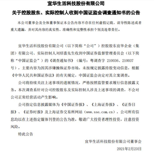 2月23日晚间,*ST宜生(600978)公告称,公司控股股东宜华企业(集团)有限公司、实际控制人刘绍喜收到证监会的调查通知书,主要内容为因其涉嫌操纵证券市场,未按规定披露持股变动信息,证监会决定对其立案调查。