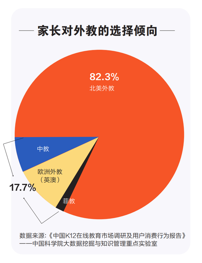 根据上述中国科学院大数据挖掘与知识管理重点实验室发布的报告显示,在线英语课程中,82.3%的家长更愿意选择并信任北美外教,欧洲外教(英澳)、中教成为第二、第三选择,愿意选择菲教的比例最低。