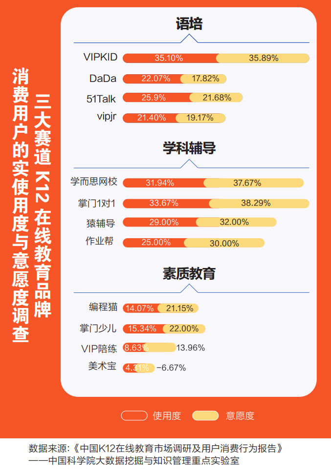具体来看,在品牌影响力方面,根据中国科学院大数据挖掘与知识管理重点实验室发布《中国K12在线教育市场调研及用户消费行为报告》显示,以掌门1对1、学而思网校、VIPKID为代表的品牌分列学科辅导和语言培训垂直赛道第一梯队。在线语培类梯度分布明显:VIPKID用户使用度和意愿度位列第一,分别为35.10%和35.89%,大幅领先其他品牌。