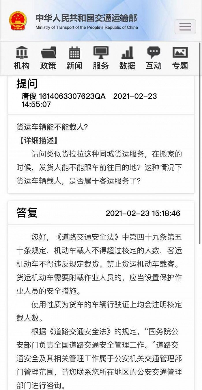 界面新闻记者就此问题,以公众身份在交通运输部网站留言咨询。交通部答复:《道路交通安全法》规定,禁止货运机动车载客;货运机动车需要附载作业人员的,应当设置保护作业人员的安全措施。