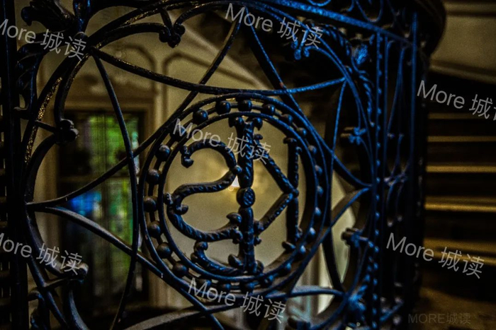 拐弯走进主楼梯,设计上显出了邬达克强项,椭圆形螺旋大楼梯,栏杆上的铁艺上到处镶嵌着刘吉生英文名缩写“KLS”,墙上彩色玻璃铅条窗,都是玫瑰花点缀。