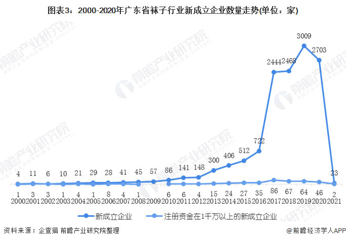 从新成立企业来看,根据企查猫的数据显示,自2016年,广东省袜子行业新成立企业呈现快速攀升的趋势。2019年,广东省袜子行业新成立企业有3009家,较于2000年的4家上升了752倍左右。而由于新冠肺炎疫情的影响,2020年,广东省袜子行业新成立企业数量有2703家。截止2021年1月11日,袜子行业新成立企业有23家。