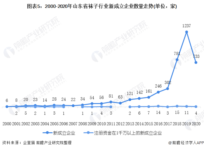 从新成立企业来看,根据企查猫的数据显示,自2013年,浙江省袜子行业新成立企业呈现快速攀升的趋势。2019年,浙江省袜子行业新成立企业有1.28万家,较于2000年的143家上升了89倍左右。