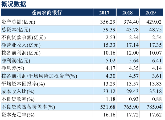 苍南农商行2019年年报显示,截至2019年末,苍南农商行的资产总额为429.02亿元,在浙江省同业排行中属于中等水平。2019年营业收入为17.35亿元,同比增长1.23%;净利润为6.41亿元,同比增长13.65%。