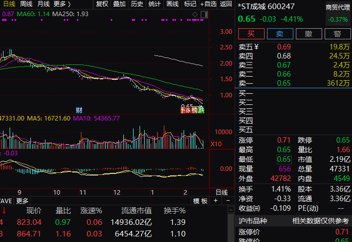 行情数据显示,*ST成城24日收盘报0.65元,至此,公司股票已连续20个交易日(2021年1月21日-2021年2月24日)收盘价格均低于人民币1元,已触及强制终止上市条件。虽然尚需交易所做出最终是否退市的决定,但触及面值退市条件的公司被豁免的情况此前尚无先例,这意味公司被强制退市基本属板上钉钉。