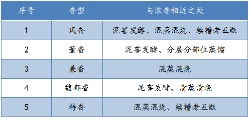 在八种香型中,以西凤酒为代表的凤香型、以董酒为代表的董香型、以白云边为代表的兼香型、以酒鬼酒为代表的馥郁香型以及以四特酒为代表的特香型,都与浓香型的工艺密切相关。