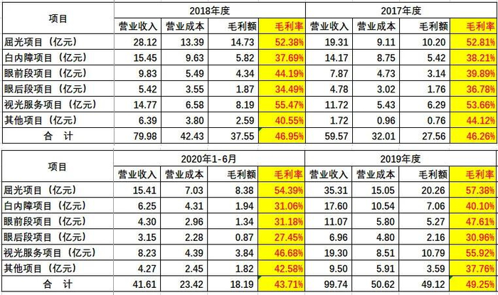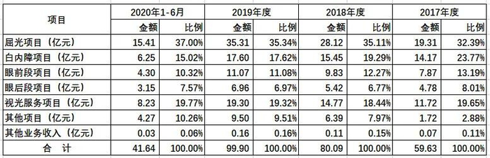 其中,屈光、视光以及白内障项目是主要收入来源,2020年上半年,三者分别占比37%、19.77%和15.02%,贡献了7成收入,从趋势上看,三大业务的收入。