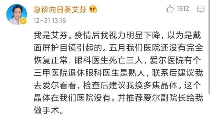2月23日,武汉抗疫医生艾芬在其个人微博回应爱尔眼科,“诚意来得太晚”。