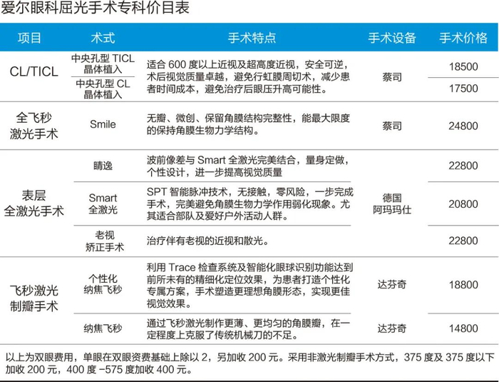 《21CBR》记者在网上找到的一份价目单中,爱尔眼科一台全飞秒手术价格在24800,艾芬所做的白内障手术,据公司一位离职员工猜测,或是“焕晶”手术,双焦点价格在双焦点晶体的价格在4万-5万/双眼,三焦点晶体的价格在8万-9万/双眼,价格不菲。