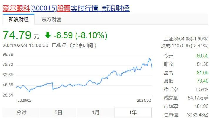过去5个交易日,爱尔眼科股价大幅回调,由最高92.69元跌到2月24日收盘的74.79元,即便如此,依然拥有3082亿市值,以此计算,陈邦身家约为1368亿元。