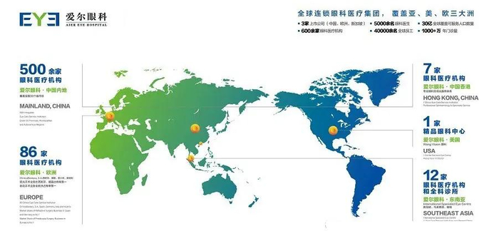 根据官网信息,其业务覆盖亚洲、欧洲和北美洲,在中国内地、欧洲、东南亚拥有3家上市公司(中国深圳:爱尔眼科,300015;西班牙:CBAV;新加坡:40T),眼科医院及中心数量达600余家,其中中国内地500余家、欧洲80余家,东南亚12家。