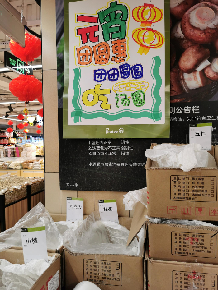 新京报记者2月24日走访北京市场发现,元宵节前各大商超均有一定的元宵、汤圆促销活动。永辉超市崇文门搜秀店打出了“元宵团圆惠 团团圆圆吃汤圆”的宣传,元宵买三斤送礼盒一个,至晚上6点多,桂花、山楂等口味元宵已接近售罄。