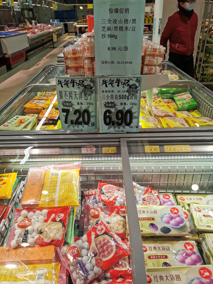 此外,各商超内所售思念、三全速冻汤圆也推出了不同折扣优惠,如思念无糖绵香芝麻汤圆原价11.8元,折后价为9.9元;三全玫瑰豆沙汤圆原价12.9元,现价仅为8.9元。在顺天府超市“牛年牛品”活动中,三全简装500g汤圆售价低至6.9元/袋。盒马鲜生则推出元宵满35元立减5元活动,邀请1人还可享受“满30元立减5元”。