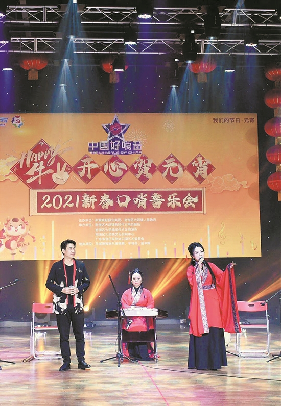 在2021新春口哨音乐会上,佛山本土口哨艺术家、首届“中国好哨音”广东口哨达人秀亚军谢智生联手YOUNG乐队,带来《迎春花》《祝福你》《欢乐年年》等迎春歌曲串烧。事实上,早在2月4日农历小年,谢智生和YOUNG乐队就带着这台《迎春歌曲串烧》口哨节目登上大沥“村晚”的舞台。值得一提的是,大沥是全国“村晚”14个展示点之一、广东唯一展示点,此次“村晚”在国家公共文化云、央视频等平台进行直播,《迎春歌曲串烧》口哨节目也随之传播到全国各地。