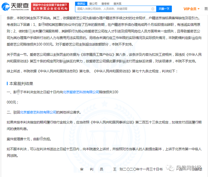 该判决书显示,原告爱奇艺公司称,2018年7月13日,其与彭某签订《非京籍员工落户协议》,约定我公司同意使用北京市户口落户指标为彭某办理落户事宜,彭某自愿承诺将不间断地在公司工作5年,服务期自劳动关系建立之日开始计算,如彭某在服务期内自行提出离职,彭某自愿依照诚实守信的原则承诺向我公司支付补偿金,补偿金按照5万元乘以未服务年限,未满一年的按月计算,并在离职前全部支付完毕。其同意从其全部应得款项中扣除该等金额,仍未结清的,应在离职前偿还全部欠款,否则应按日加付1%的逾期罚金。