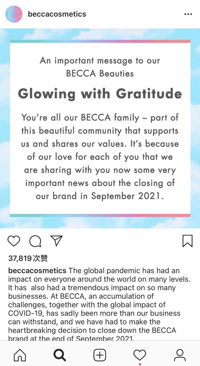 新京报讯(记者 王胜男)受疫情影响,雅诗兰黛旗下彩妆品牌Becca Cosmetics(以下简称“Becca”)于2月24日宣布将在今年9月关停。Becca表示,疫情对世界各地的每个人都产生了影响,并且对很多企业也产生了巨大影响。对于Becca来说,挑战不断累积,全球疫情的影响也越来越大,并超出了Becca的业务承受能力。