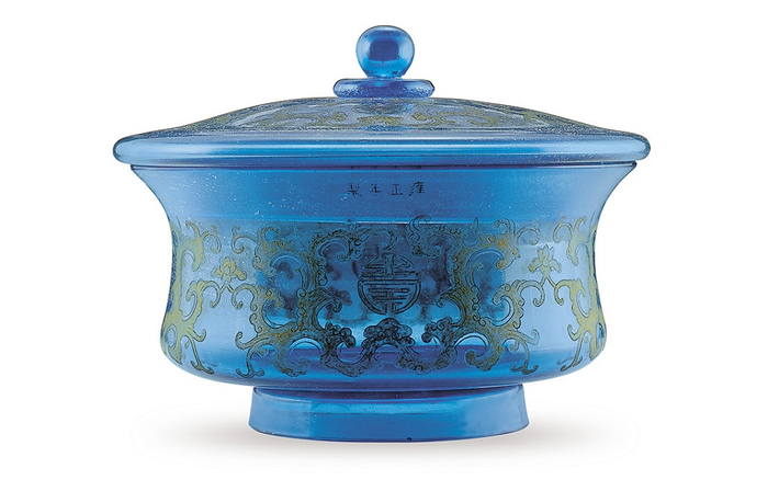 砣刻泥金莲花寿字纹玻璃盖碗,清雍正