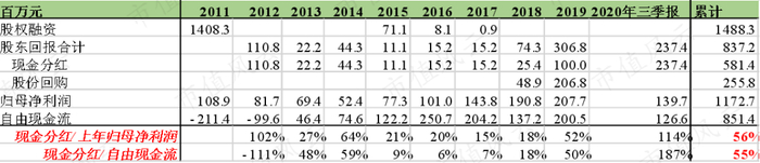 累计现金分红占累计上年归母净利润的比例高达56%,占累计当期自由现金流的比例高达55%。