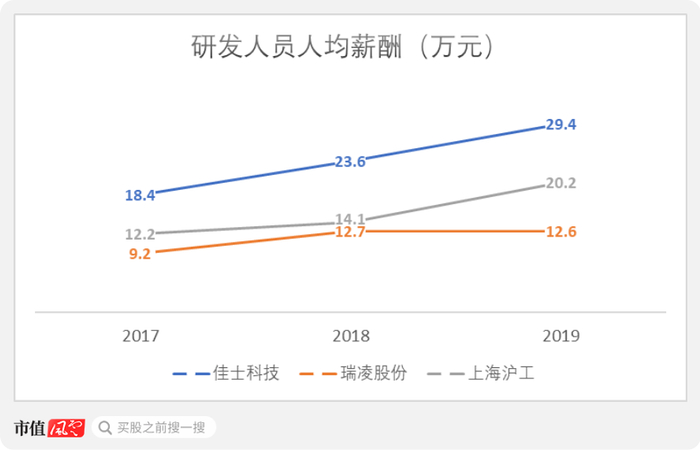 不仅如此,佳士科技研发人员人均薪酬在2019年高达29.4万,超过瑞凌的2倍,也大幅高于上海沪工的20.2万。