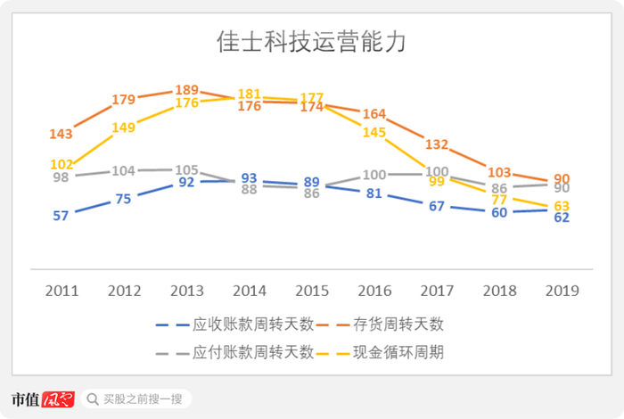 从实际结果看,2015年至今佳士科技的存货周转天数从174天下降到90天,同时应收账款周转天数也有所加快,带动现金循环周期减少了114天至63天。