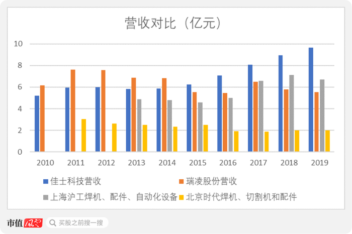 2019年佳士科技营业收入达到9.7亿,瑞凌股份5.5亿,上海沪工焊机、配件、自动化设备营收6.7亿,北京时代的焊机、切割机和配件营收2.0亿。佳士领先优势很明显。