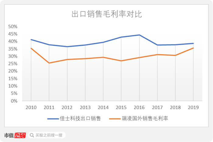 但是,佳士科技的出口毛利率可以说是吊打瑞凌。最近3年,两者的平均值相差5.5个百分点,之前的差距则更大。
