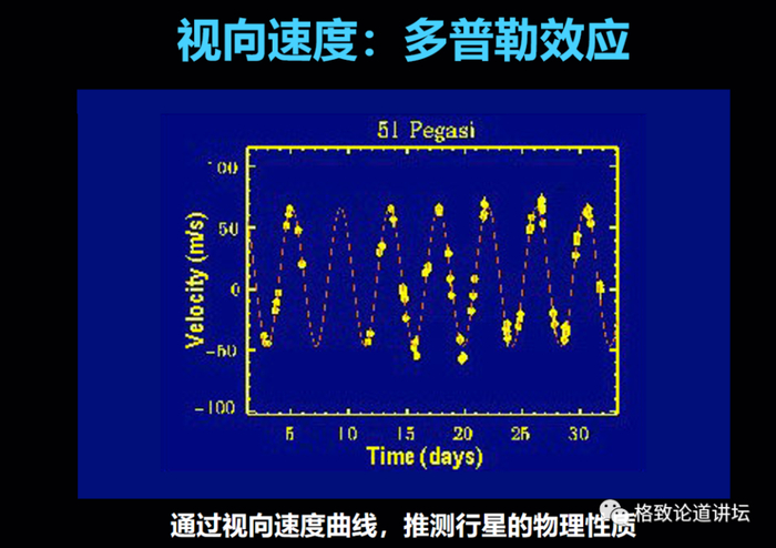图上黄色的点就是天文学家拿到观测的一些数据点,如果你把那些点慢慢用曲线连接起来,就可以得到刚才上一幅类似的那个视向速度的曲线。