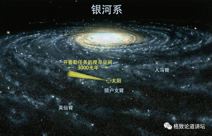 图上的开普勒是探测系外行星的一个空间望眼镜,这个黄色的三角型区域就是它所观测的天区,其实这么一个天区和整个银河系比起来也是很小的。